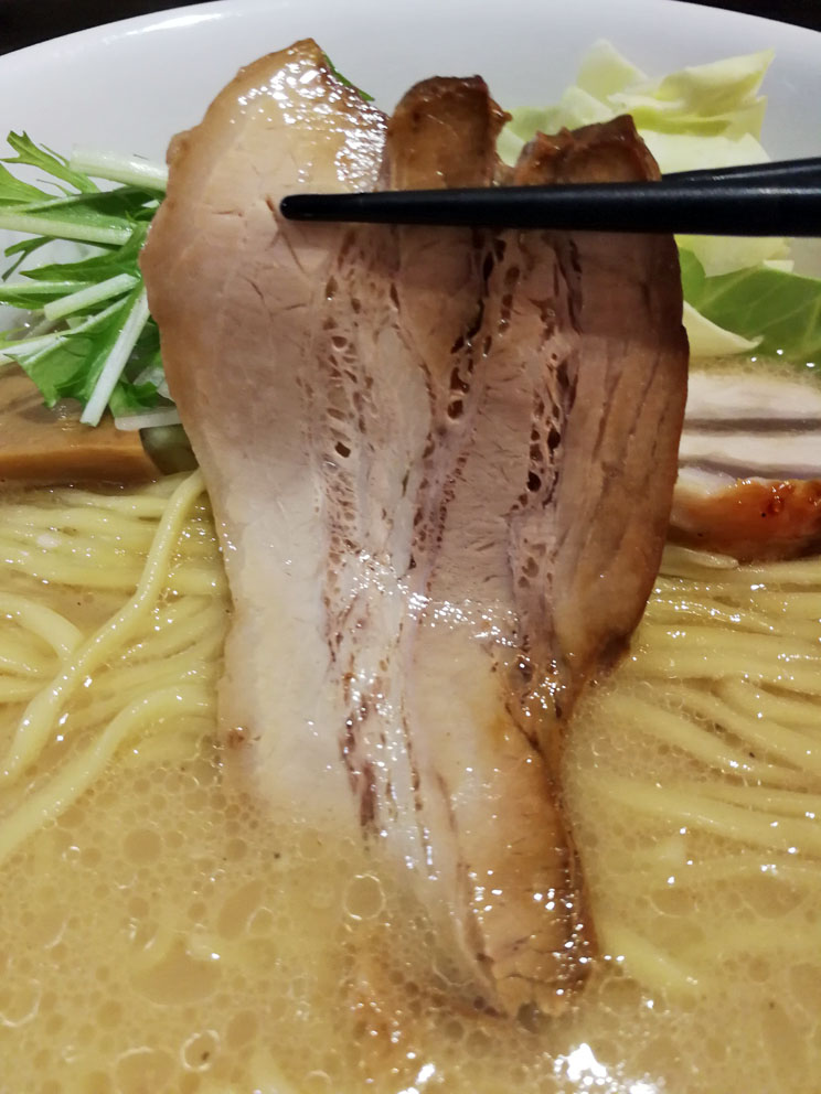 チャーシューは炙りバラチャーシューと珍しいグリルの鶏チャーシューです。鶏チャーシューの方はこんがりと焼かれていて香ばしいです。