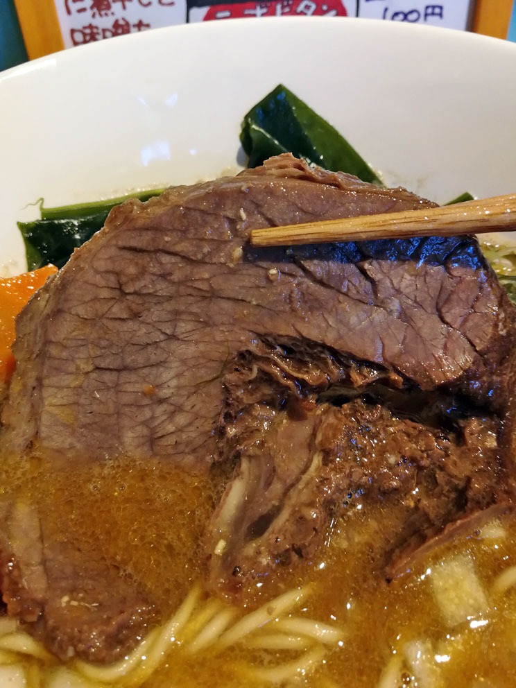 スープはビーフスープに煮干しと味噌を合わせていて、何と表現したらよいか戸惑う奇抜な味わいです。今まで色々なラーメンを食べ歩いてきましたがこの味のラーメンは食べたことがないですね・・・。
