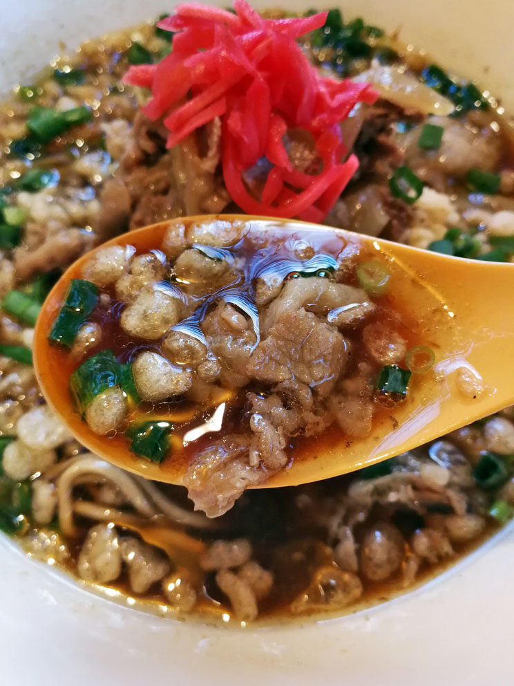 たっぷりの牛肉とタマネギ、刻んだ青ネギ、天かす、紅ショウガが乗ります。まさに牛丼ラーメンですね!