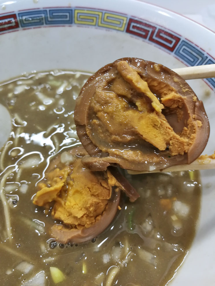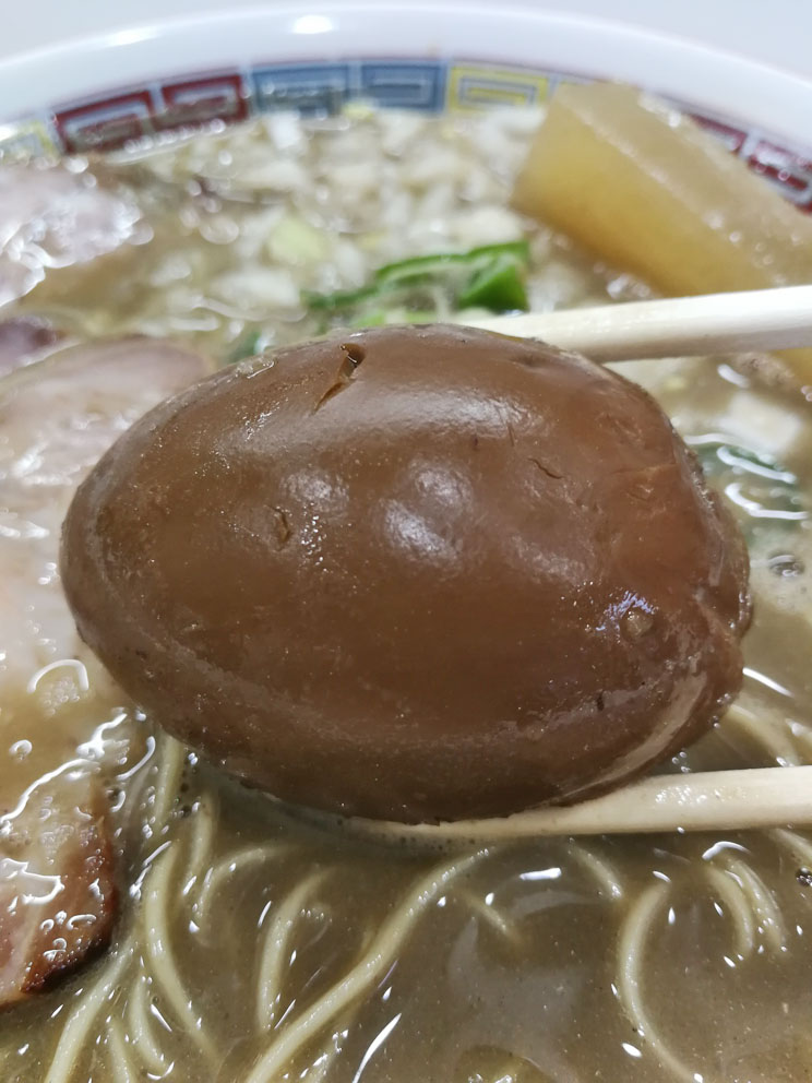 店長が「まだ残ってました!」といって容器の中から取り出してくださった煮玉子は、味が浸み込んだ3日ものの煮玉子!