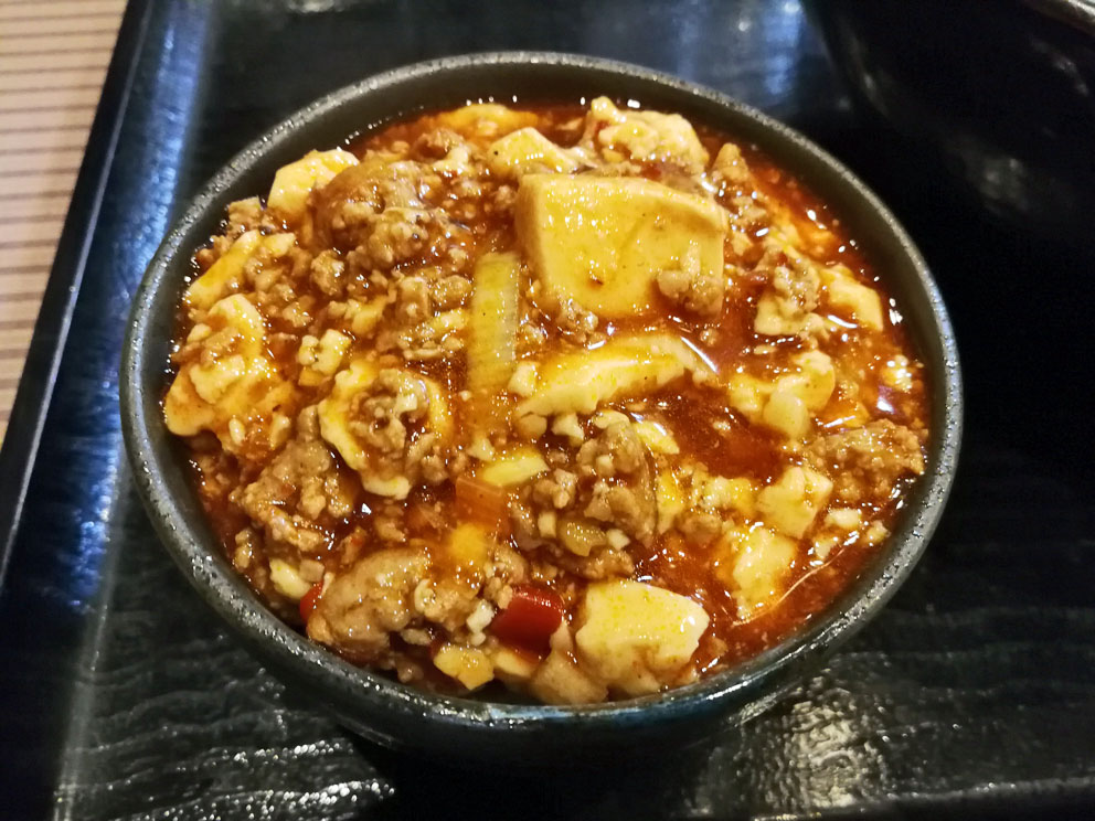 麻婆豆腐はPOPにあるような鮮烈な赤色をイメージしていましたが、どす黒い色をしています。