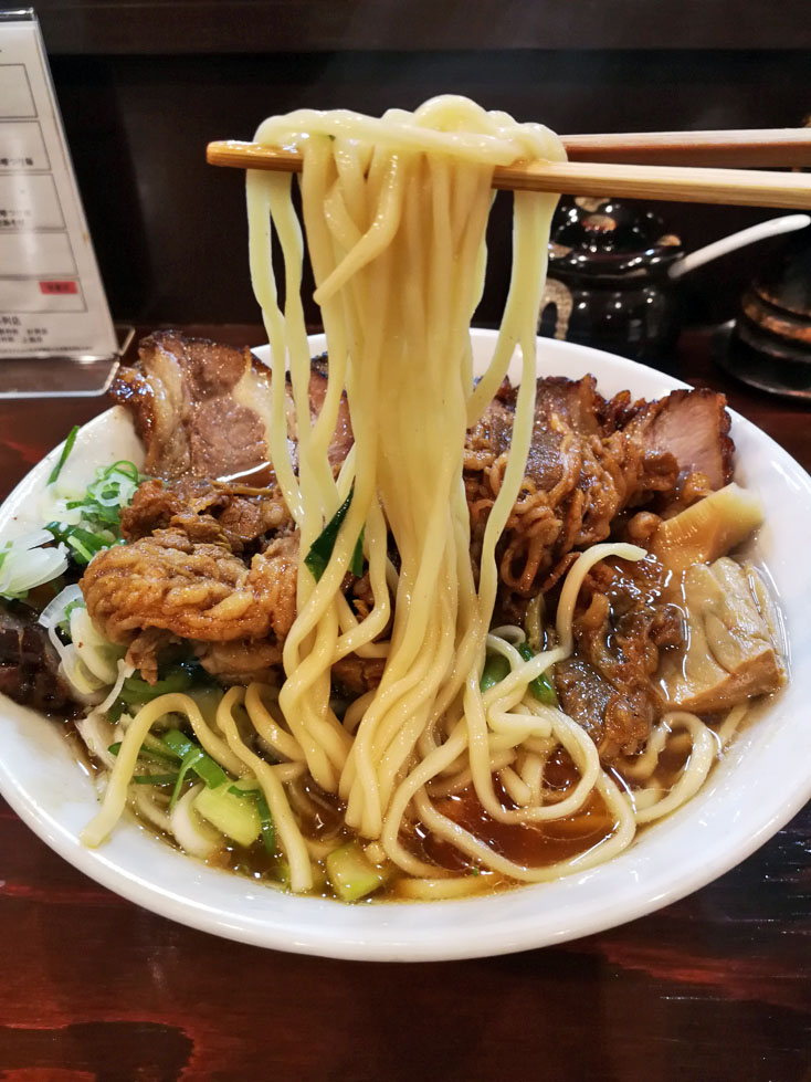 麺は中太麺でツルツルとした食感です。適度な太さもあるので、たっぷりのお肉にも負けない存在感です。