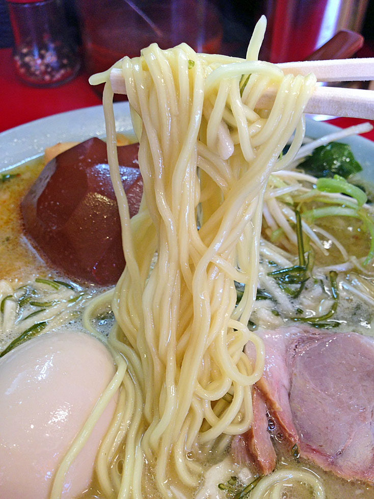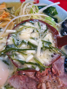 具は、チャーシュー、芽かぶ、山芋とろろ、味付白髪ネギ、メンマ、のり、わかめ、そしてトッピングの半熟あじ玉、と”てんこもり”です。