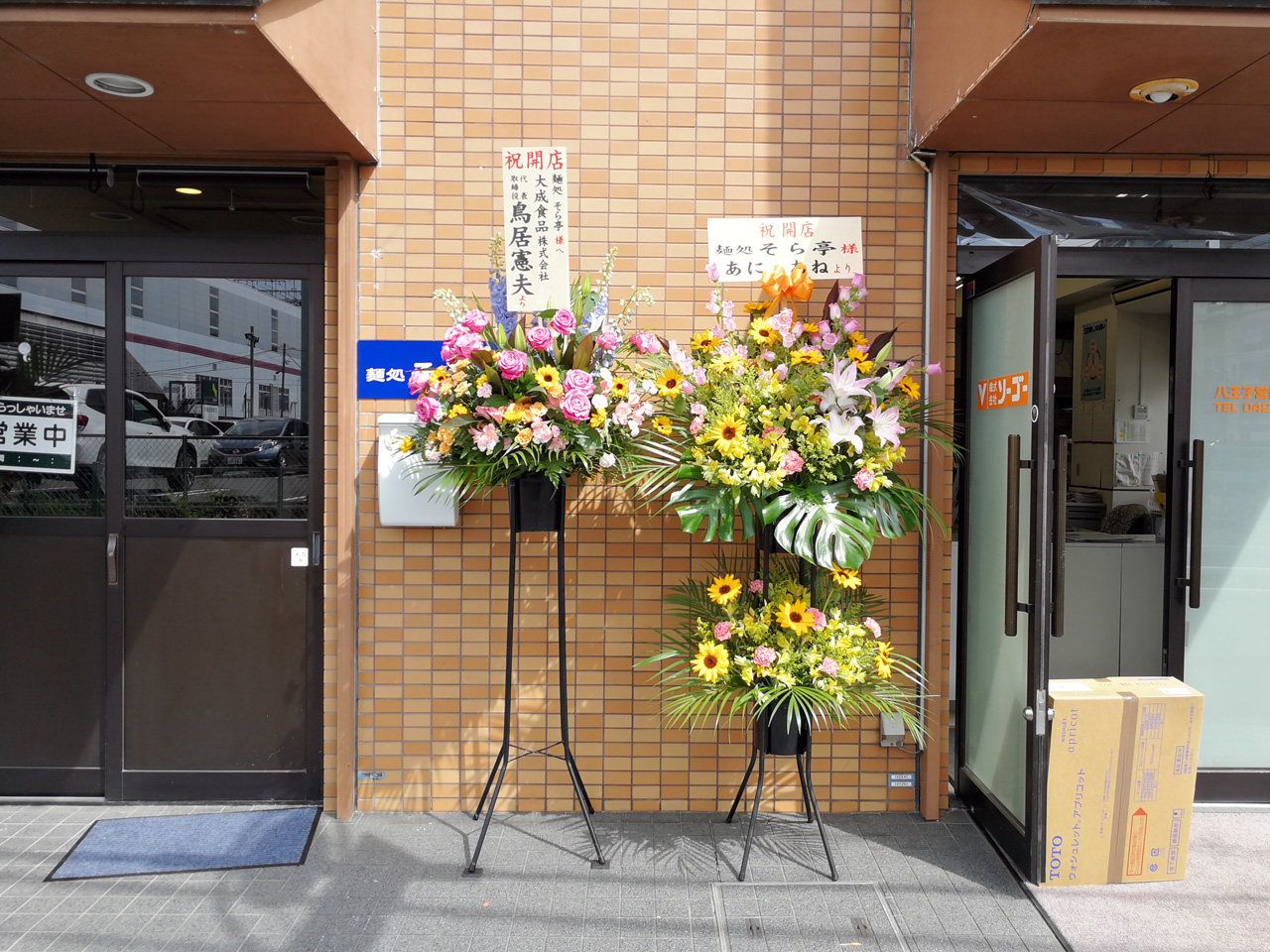 店頭には、オープンを祝うお花が飾られていました。いずれも店主が働いていたことのあるラーメン店から贈られた花々なので、店主の経験の豊富さが伺え知れます。