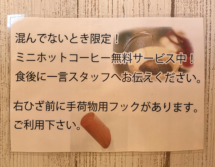 混んでいないとき限定と記載されていますが、忘れている場合もあるので、一言スタッフに声を掛ければ提供してもらえると思います。