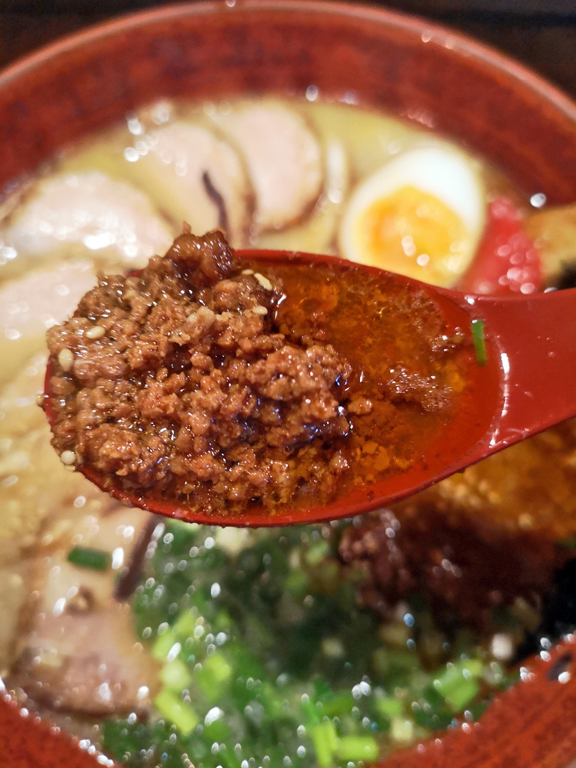 スープの中に隠れている溶き卵、チーズ、ひき肉などが、麺に絡みついてくると、その麺を啜るのがまた格別に美味しい!