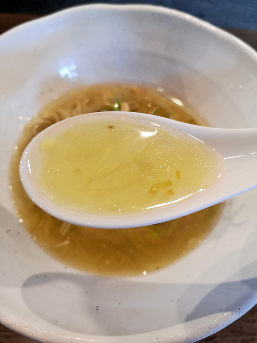 スープは、地鶏と魚出汁のスープにネギ油を浮かべ、塩のかえしで味を整えているそうです。