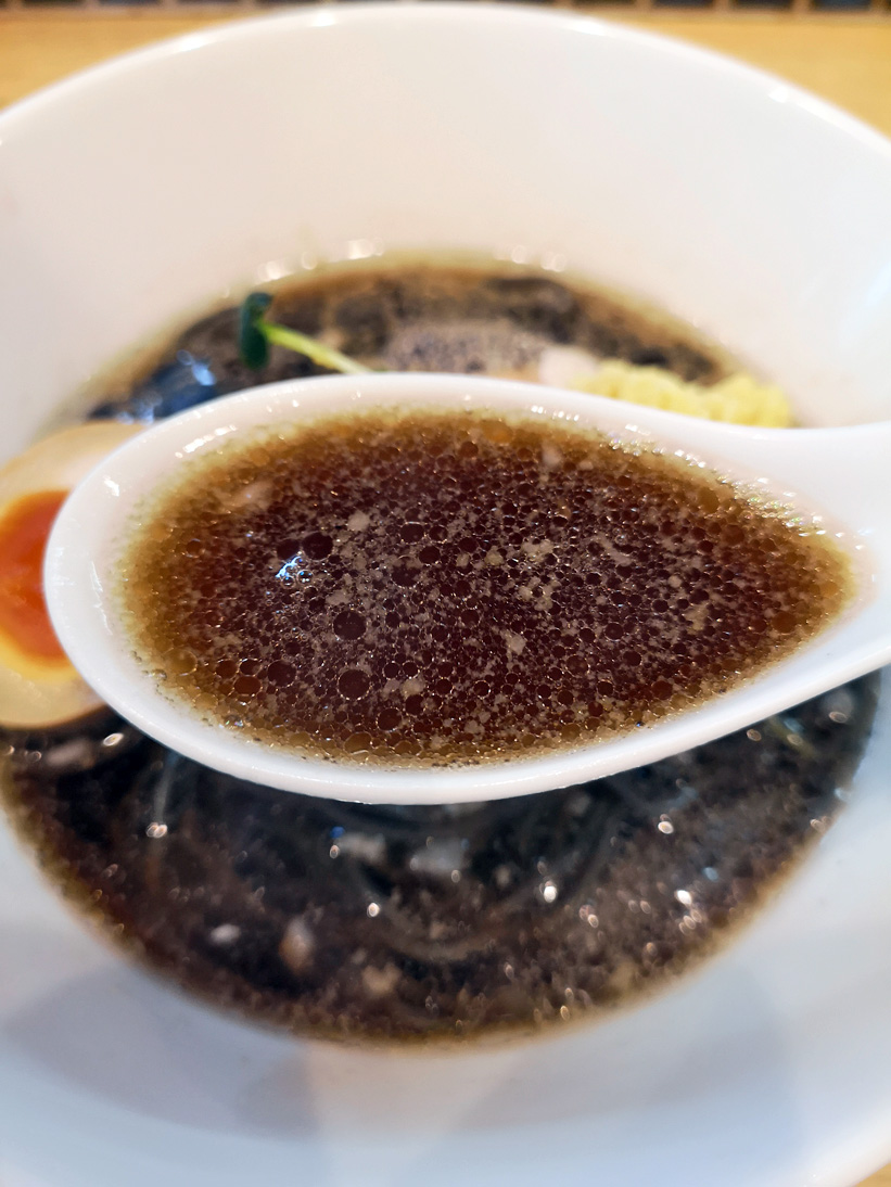 かえし、麺に樫炭を合わせており、そのためスープも麺もつややかな漆黒をしています。そして、これがますます想像力を掻き立て、ラーメンをミステリアスに魅惑的に仕上げていました。