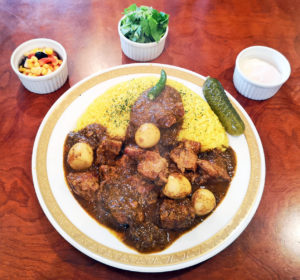 スパイスで黄色く色の付いたターメリックライスにゴロゴロっと大量に入った豚肩ロース肉が凄く美味しそうです。