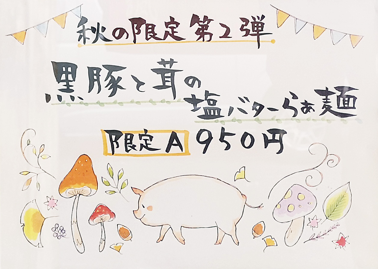 第2弾は秋らしく「黒豚と茸の塩バターらぁ麺」です。