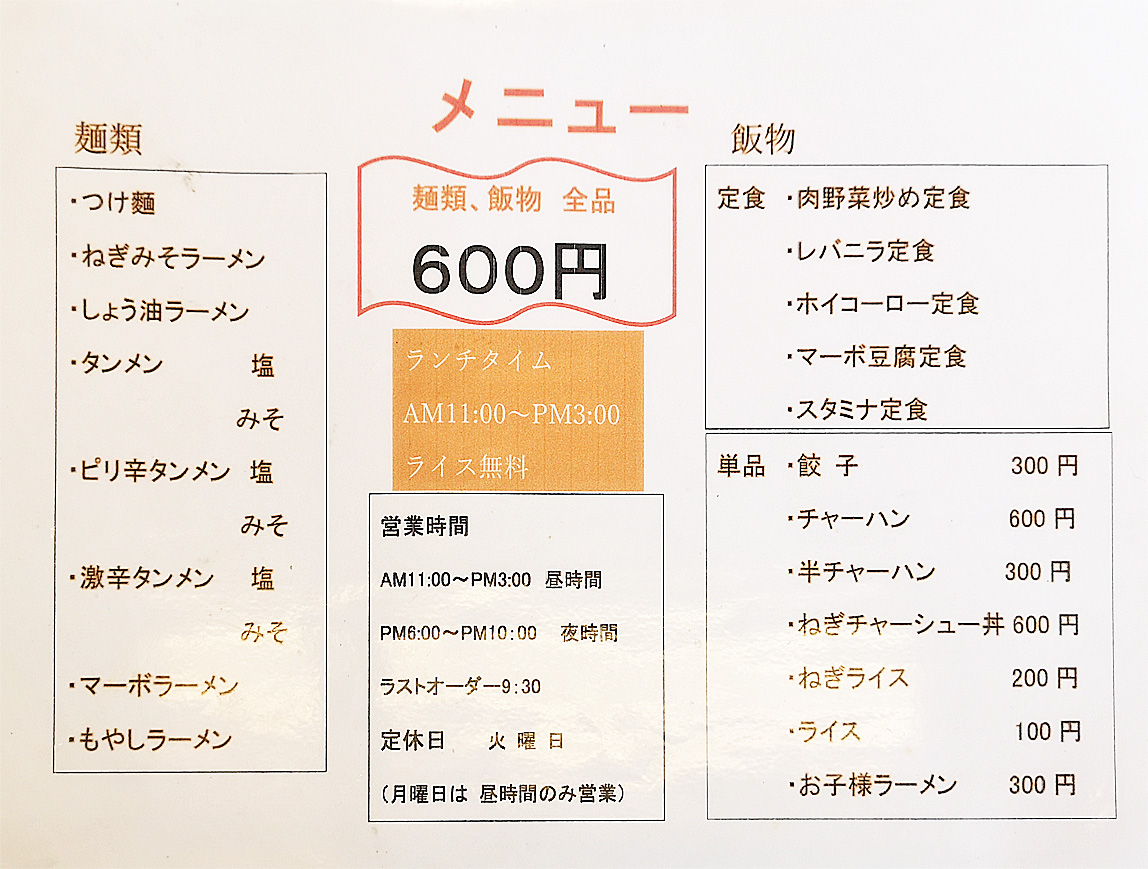 備考:麺類、飯物、全品600円。ランチタイム(11時~15時)ライス無料