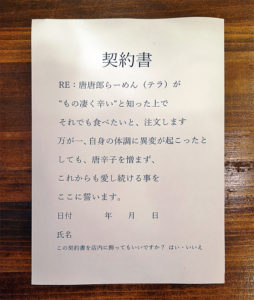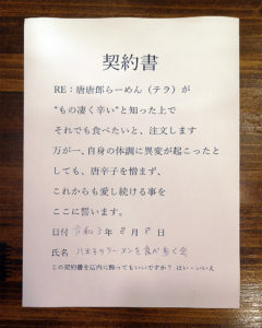 それにしても、この手の誓約書はお店の免責に終始することが多いのに、そういう文言ではなく”唐辛子を憎まず、これからも愛し続ける事をここに誓います。”とあり、店主の激辛ラーメンへの愛情を感じます♪