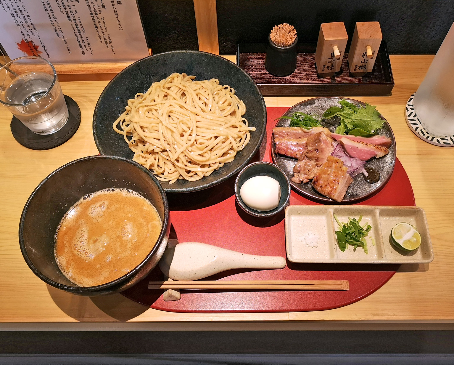 麺、スープ、鴨肉の載ったお皿、味玉、すだち、三つ葉、粟国の塩の入った小皿が並びます。