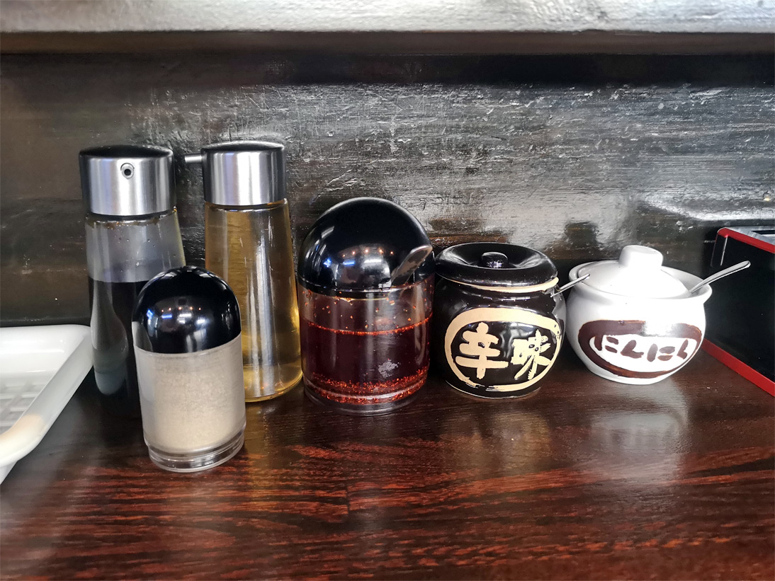 卓上調味料は、醤油、お酢、辣油、胡椒、辛味調味料、おろしニンニク、です。