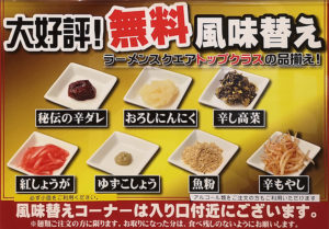 秘伝の辛ダレ、おろしにんにく、辛し高菜、紅しょうが、ゆずこしょう、魚粉、辛もやし。