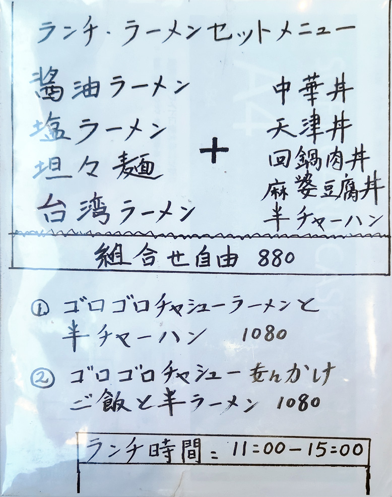 今回は、看板メニューっぽい、ゴロゴロチャーシューラーメンと半チャーハンのセットを注文することに決めました。