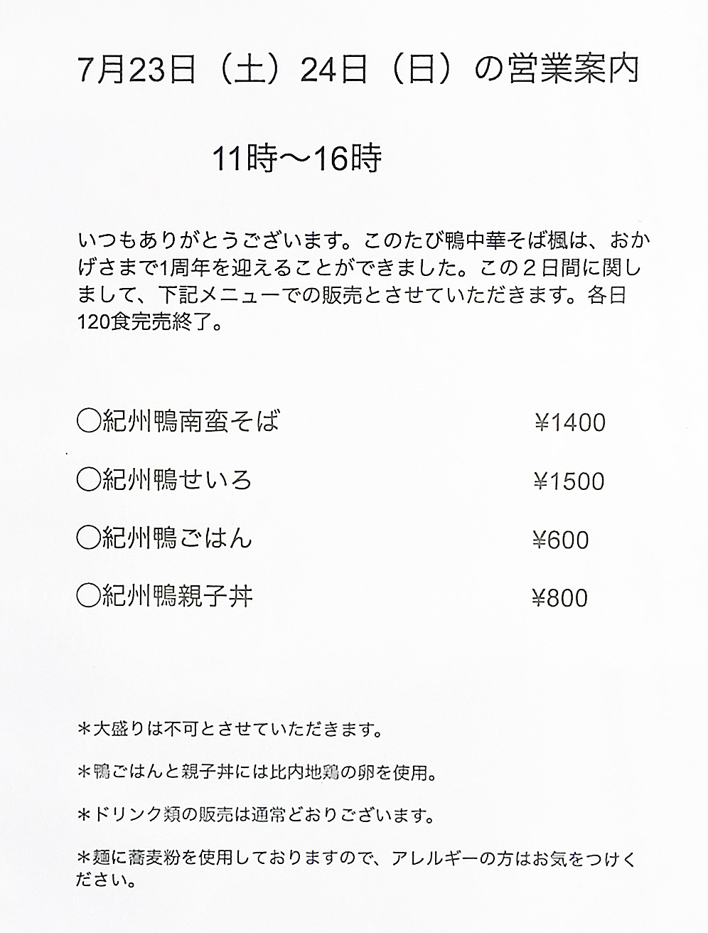 今日は、1周年記念を迎えた「鴨中華そば 楓」に行って来ました。
