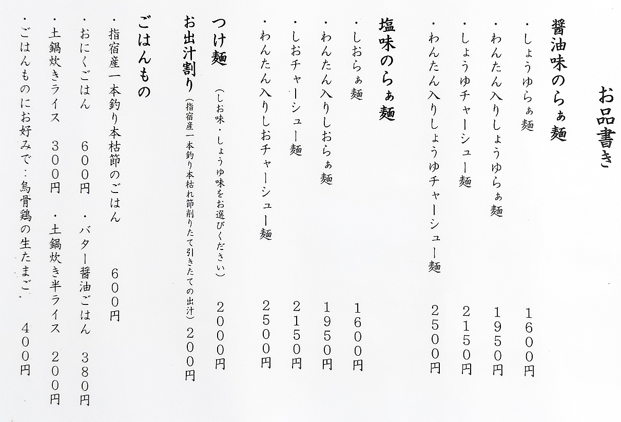 ちなみに、今回の価格改定では「しょうゆらぁ麺」1300円→1600円、「つけ麺」1800円→2000円に価格改定されました。