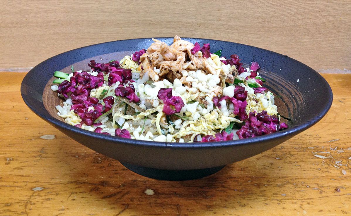 鶏肉、柴漬け、キュウリ・・・とにかく色々と乗っています。