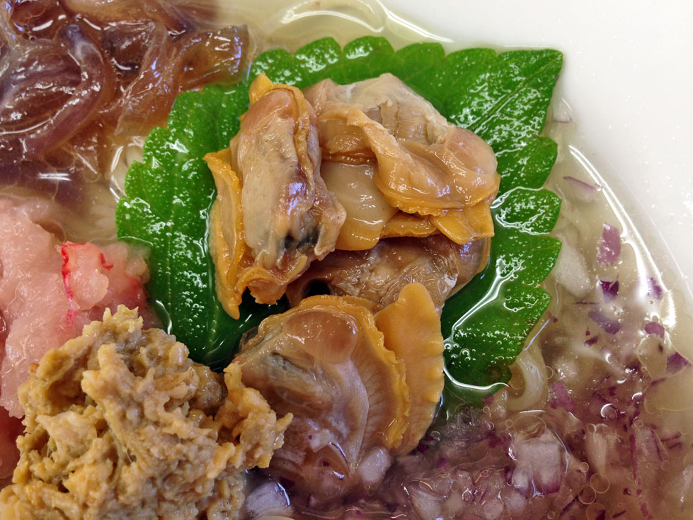 具材は、青紫蘇の上に盛り付けられたホンビノスの身、刻み紫タマネギ、味付けされたタマネギ、鯛のすり身、レンゲにはホンビノスのペーストが盛られています。