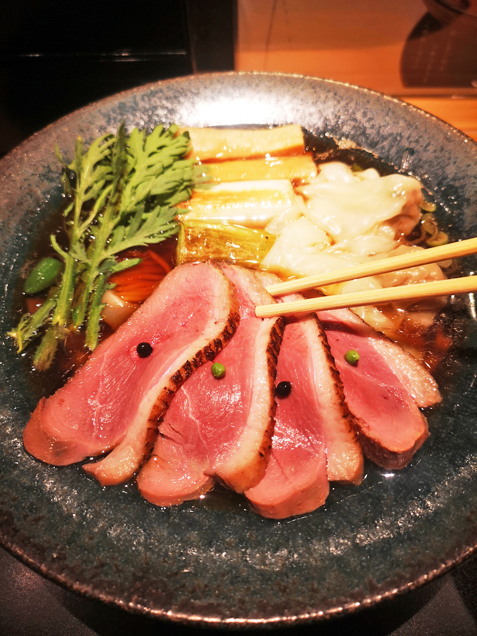 具は、鴨ロースが4枚、焼葱、メンマ、春菊、ワンタンなど。
