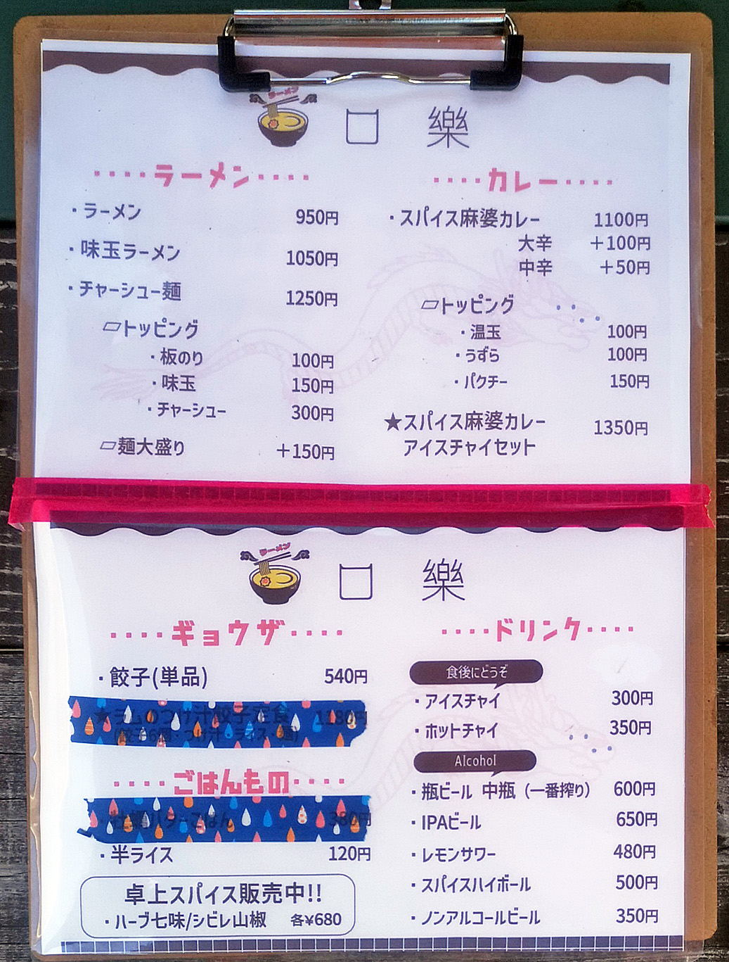 メインメニューは、「中華そば」と「スパイス麻婆カレー」です。