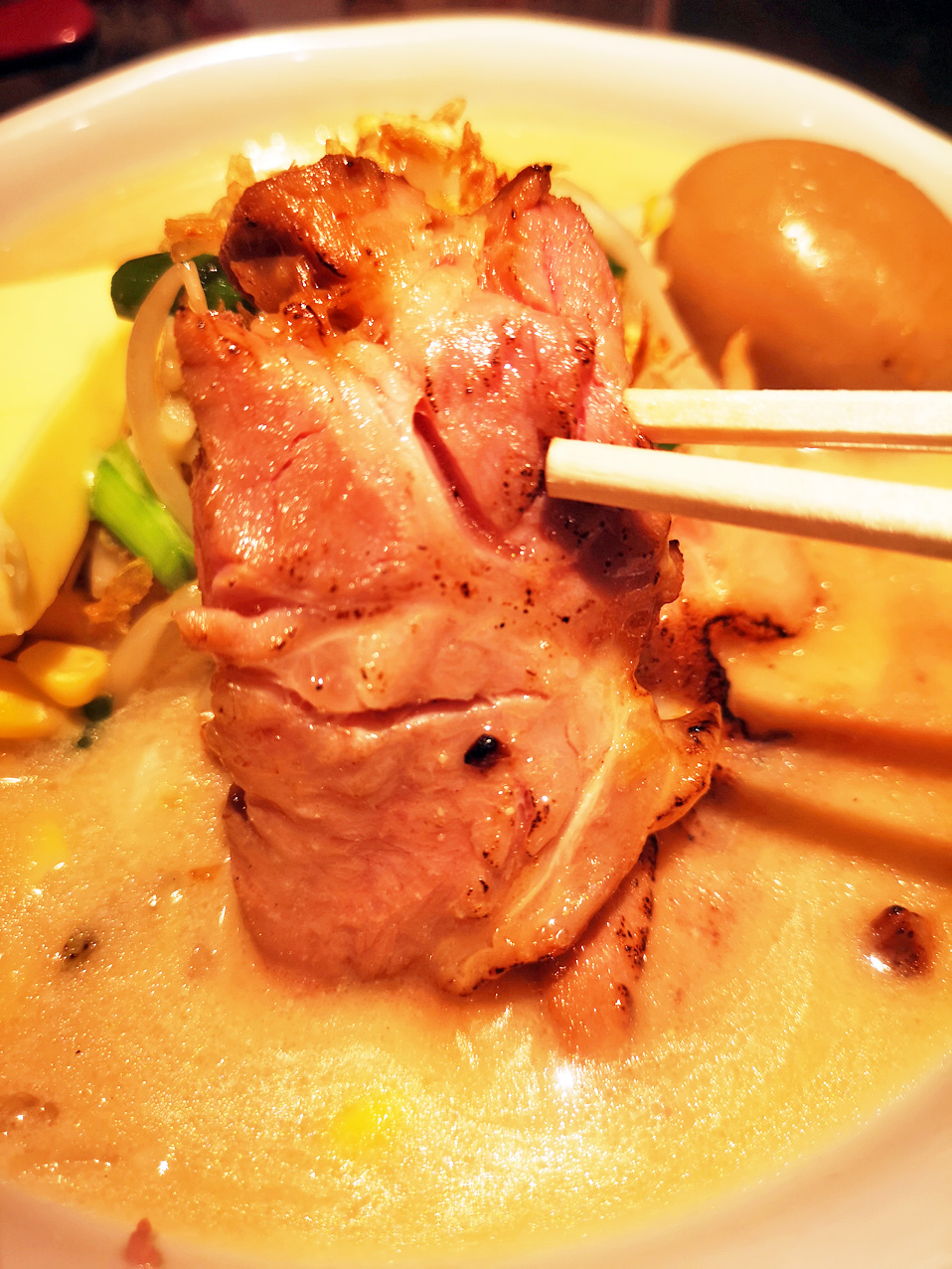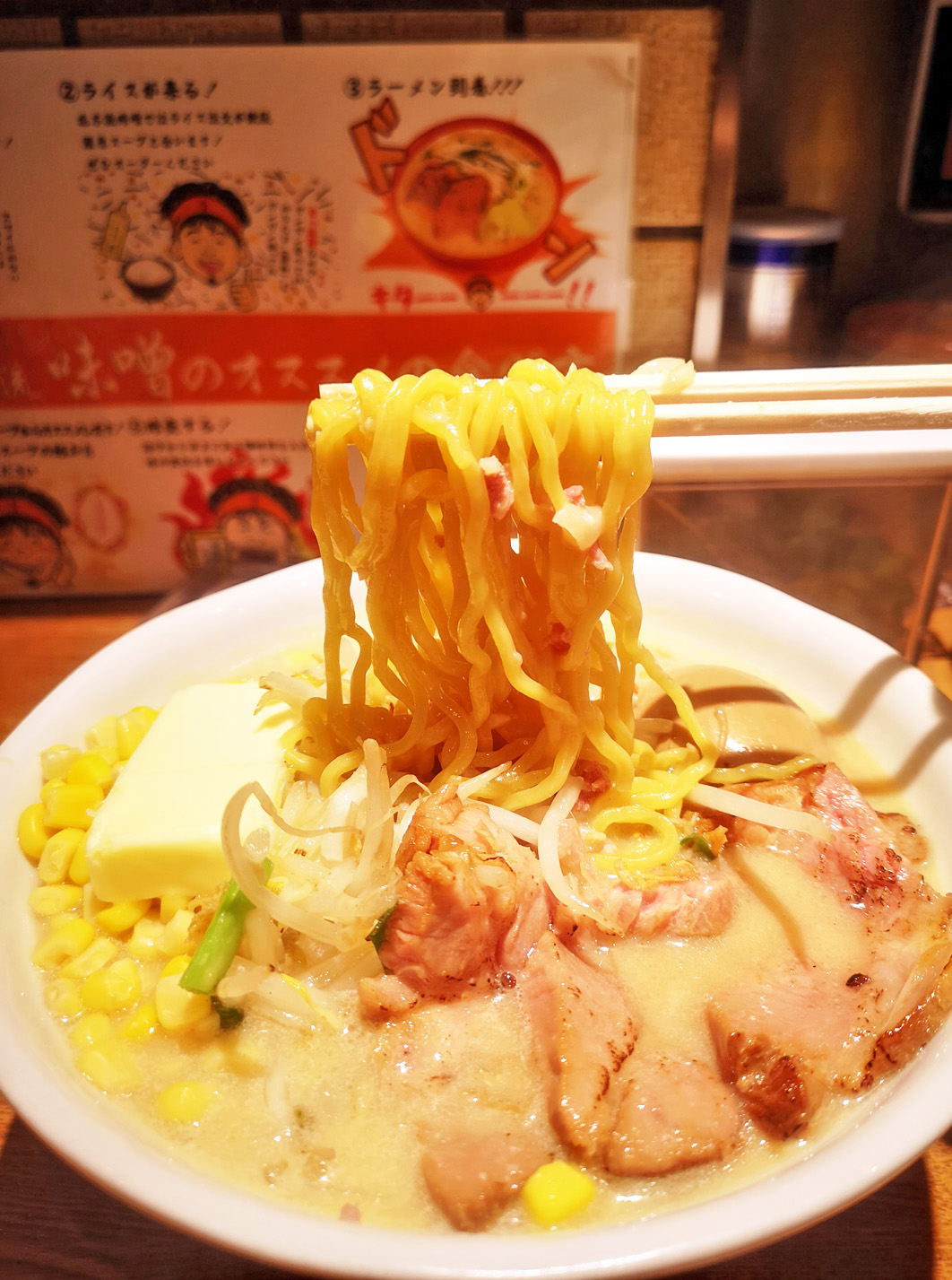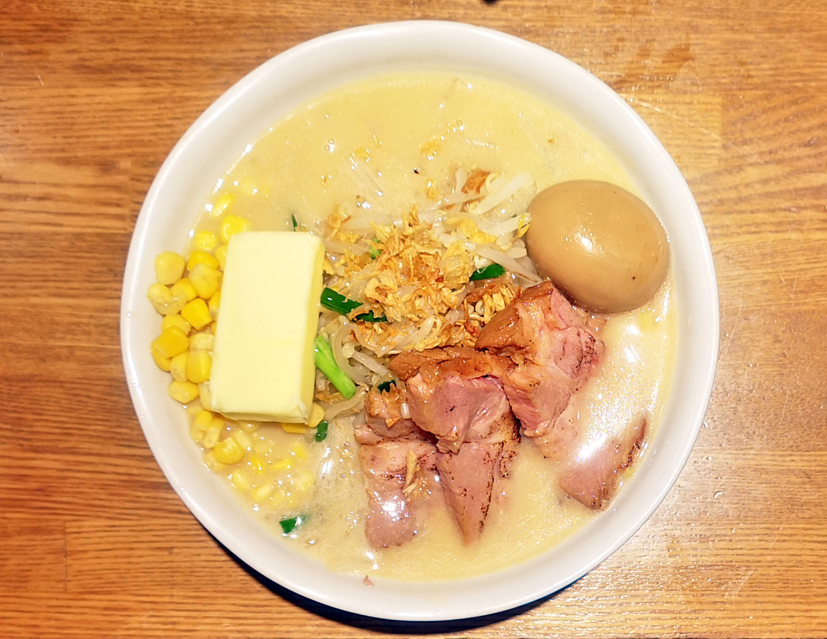 具は、チャーシュー、もやし、玉ねぎ、ニラ、味玉、コーン、バター、フライドオニオン、など。