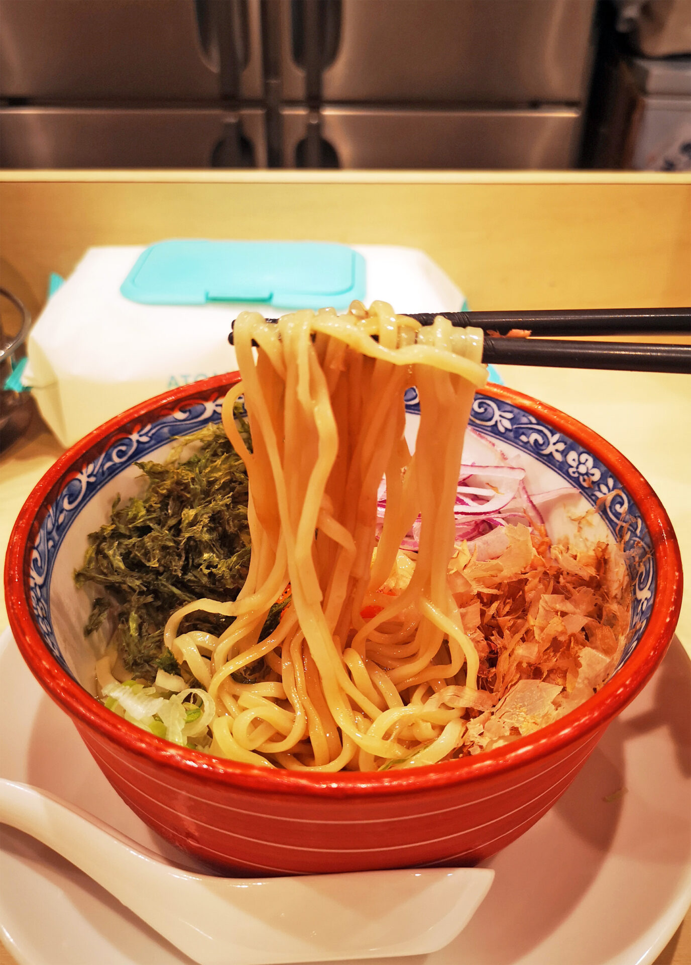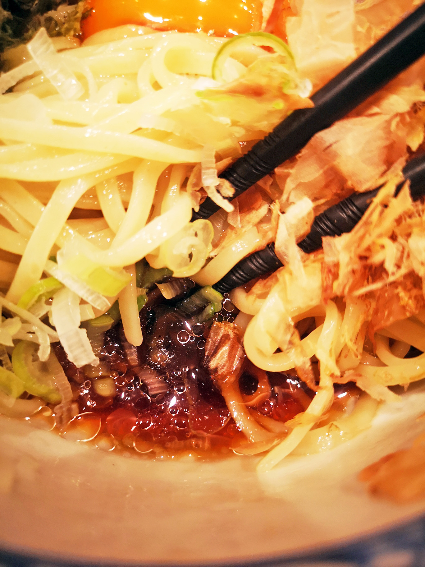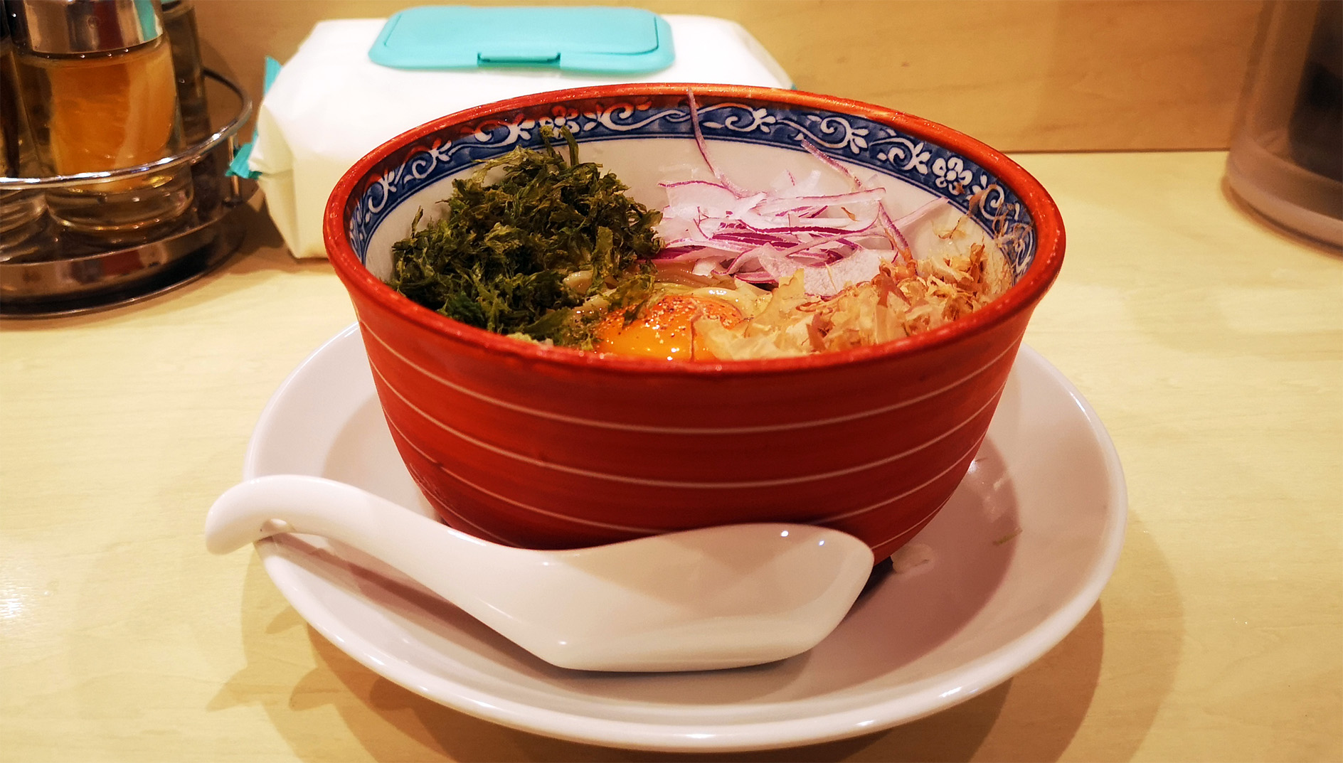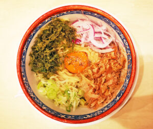 トッピングは、スライスされたアーリーレッド、岩海苔、ネギ、鰹節、卵黄です。
