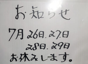 7月の26日、27日、28日、29日は、お休みです。