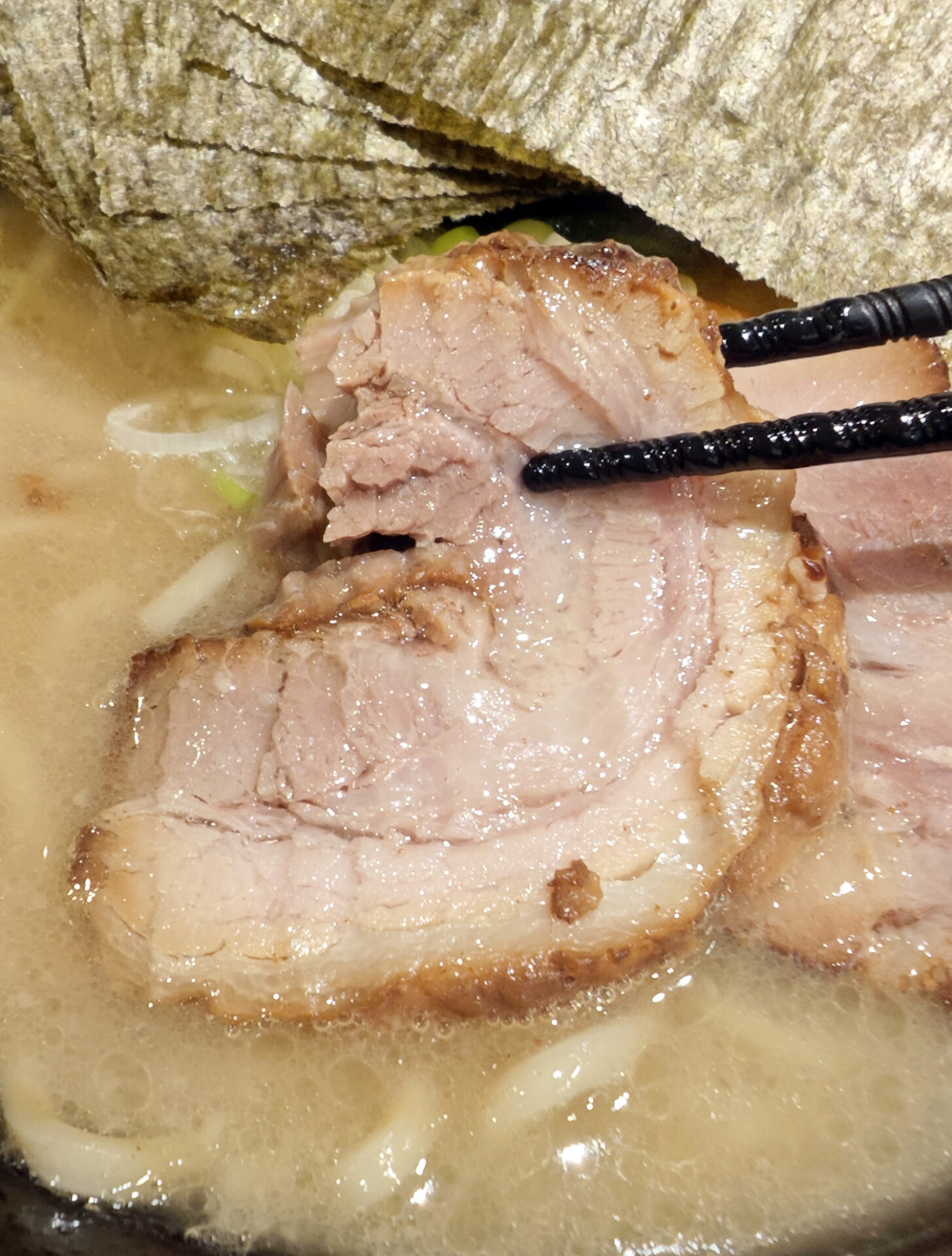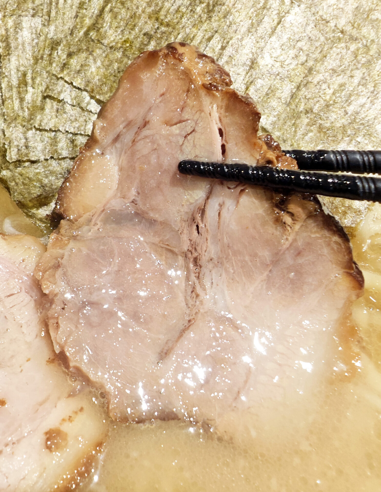 ”Wチャーシュー”なので、バラとロースの2種類が乗ってきます。