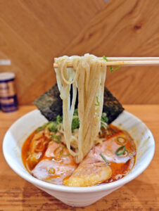 スープとの相性はもちろんのこと、平打ち麺の食感が、のど越しにおいても楽しませてくれます。