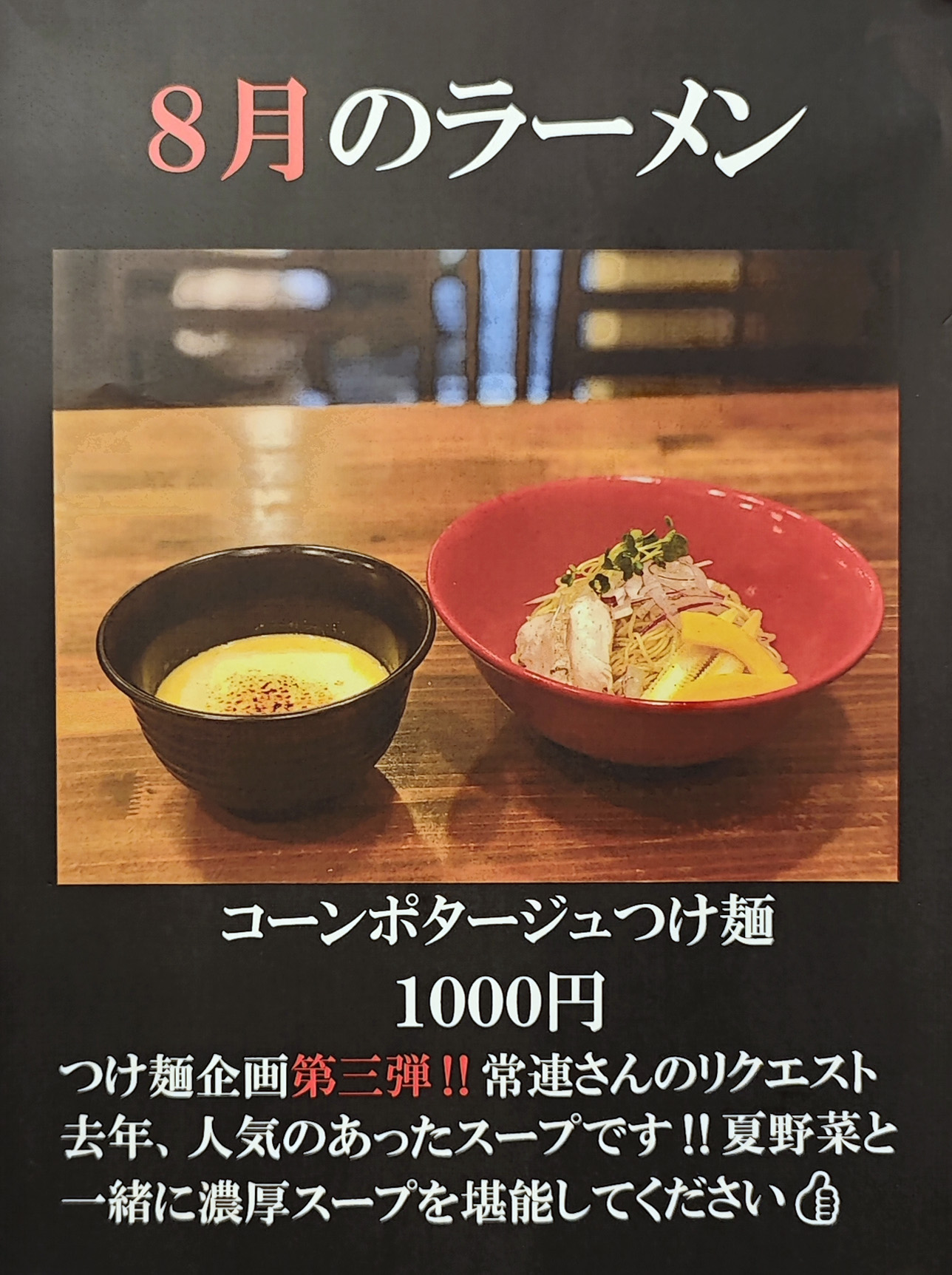 先月(7月)の限定「アスパラと豆乳のつけ麺」は、引きが弱いと思っていましたが・・・