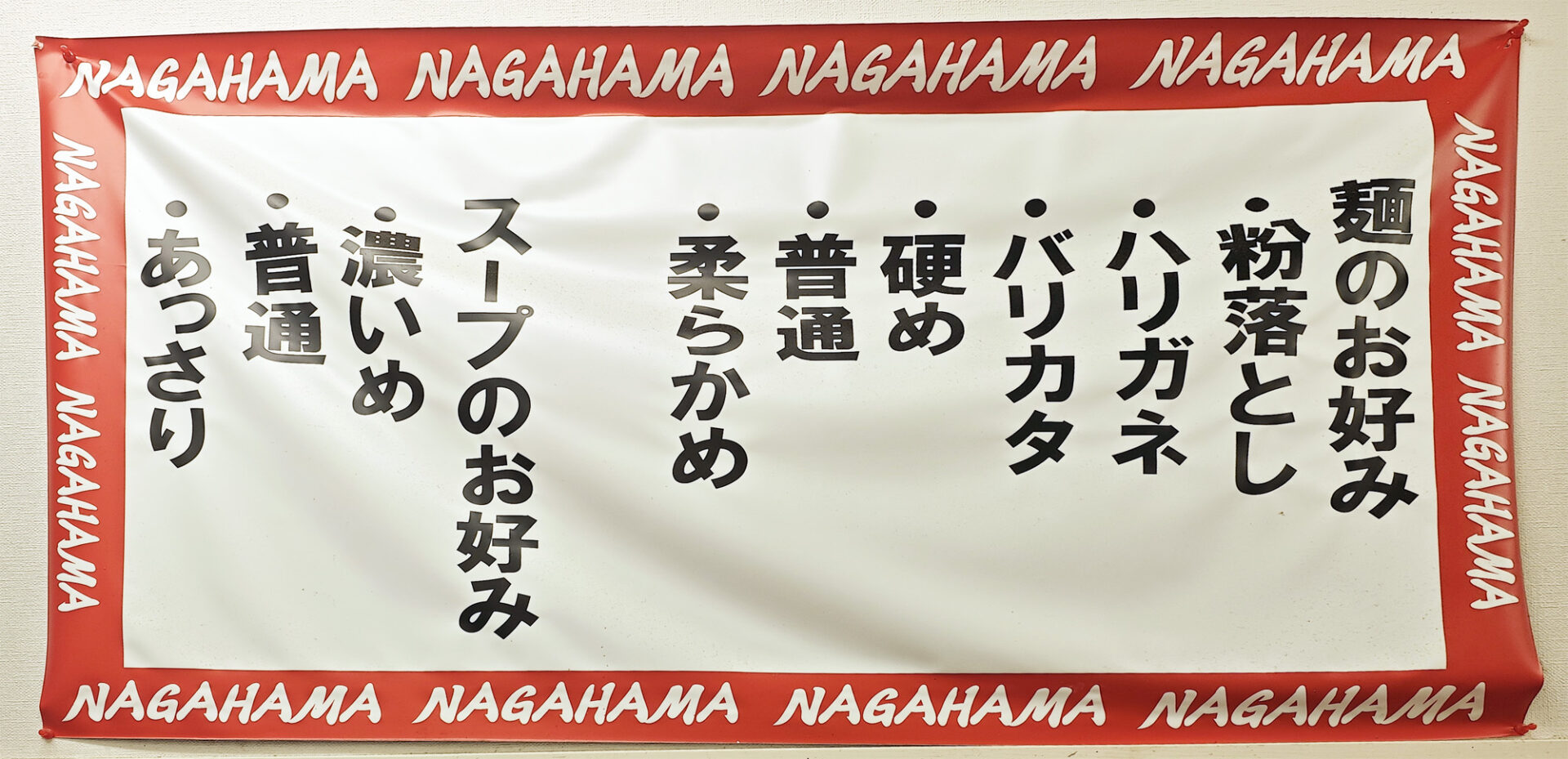 麺の好み(柔らかめ、普通、硬め、バリカタ、ハリガネ、粉落とし)と、スープのお好み(あっさり、普通、濃いめ)を選べます。