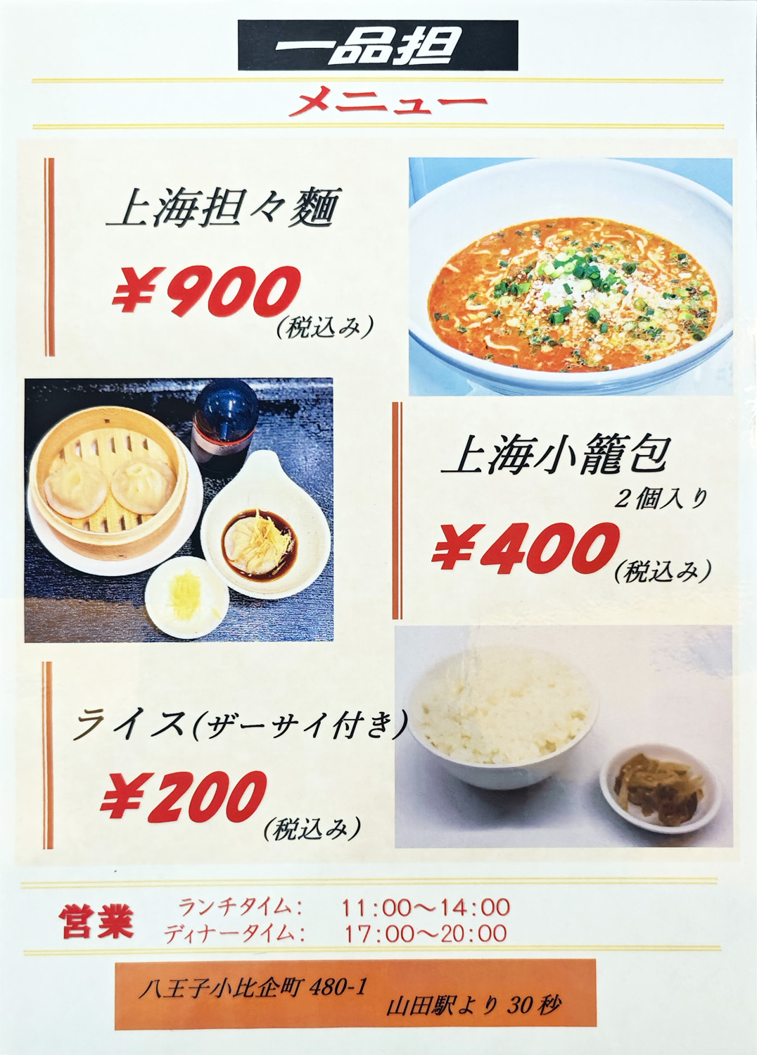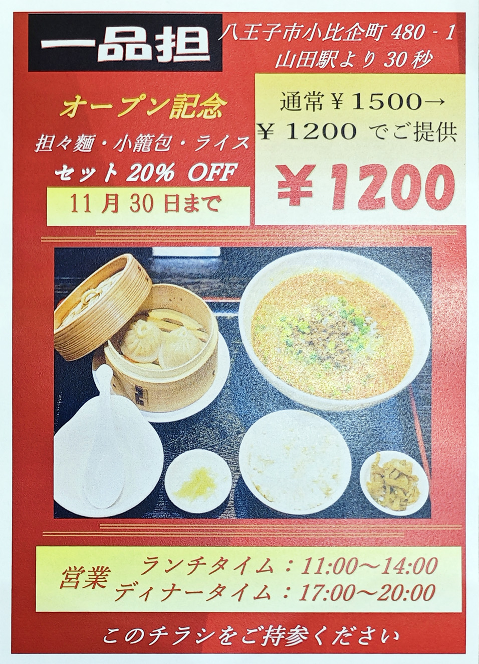 本日は、オープン記念として「担々麺」「小籠包」「ライス」が通常1500円のところ、1200円とのこと。
