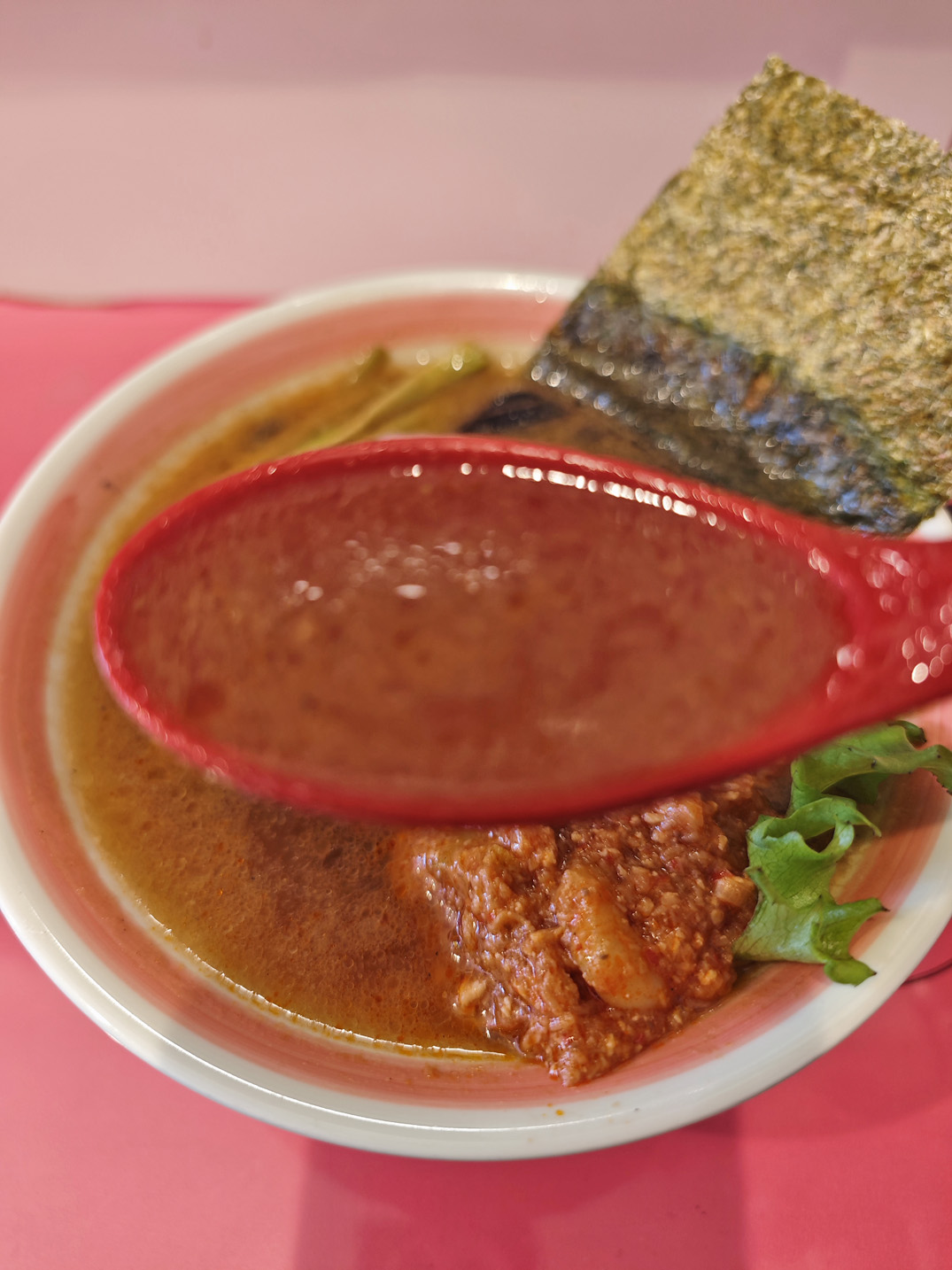 トッピングとしては珍しいエビチリは、スープに溶かしていくことで、海老の風味が増していきます。