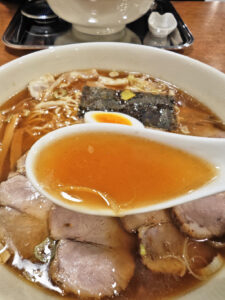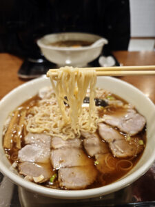 スープは、煮干しがガッツリと効いていて、表面に浮かぶラードも、香りをしっかりと主張しています。