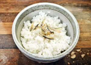 茶漬けめしには、約1年半前から仕込んだ鮎の塩漬け(アンチョビー)が、ご飯の上に乗って提供されます。