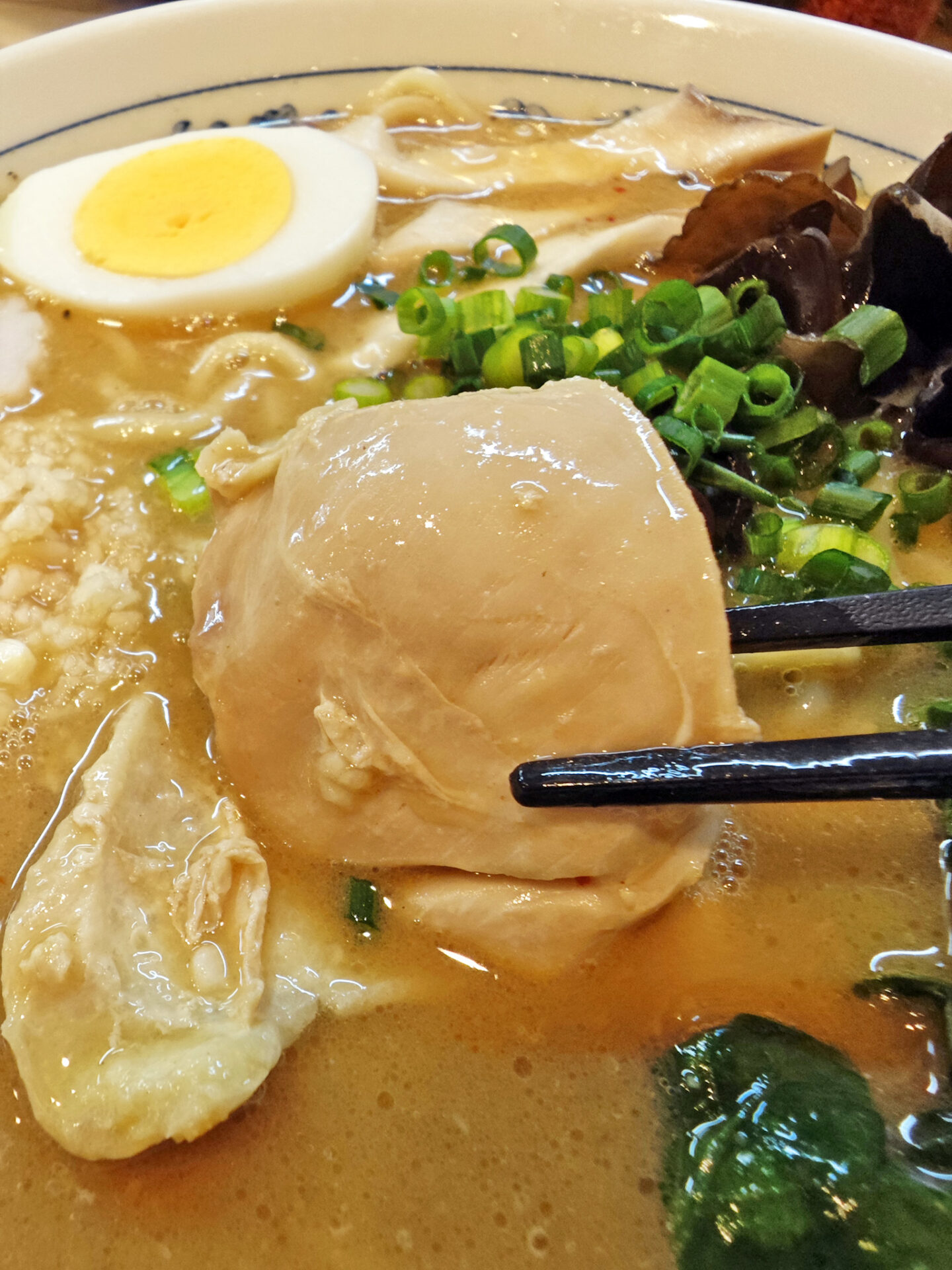 具は、鶏肉、エリンギ、キクラゲ、ほうれん草、ゆで卵、ナルト、ネギ、など。