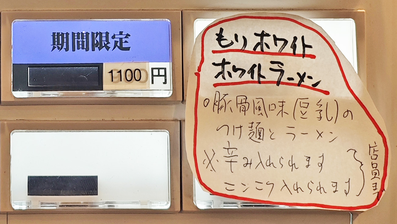 「もりホワイト(つけ麺)」か「ホワイトラーメン」を選択できます。