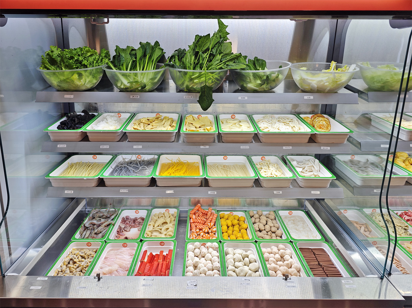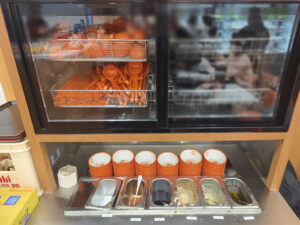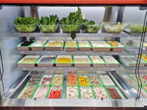 基本的には、容器(ボウル)とトングを使って、棚にある好みの具材を選べば良いです。