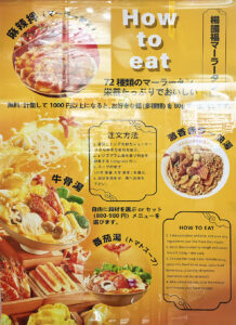 「激香赤ラー油湯」「牛骨湯」「麻辣湯」「番茄湯(トマトスープ)」「麻辣拌(マーラー和え)」