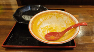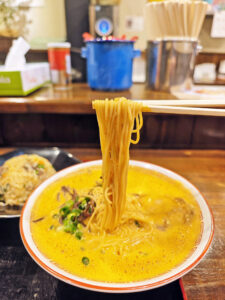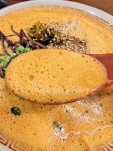 豚骨と煮干しのスープに辛味調味料が加わり、濃厚な中に、ピリピリするような辛味があります。