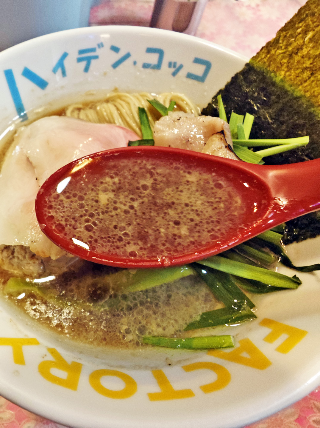 スープは、和牛シマチョウをじっくり炊いているそうで、表面には厚みのある油の層が見られます。