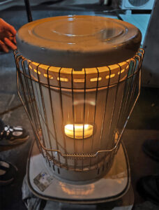 なんと、外待ちのお客さん用に、石油ストーブが炊いてありました。