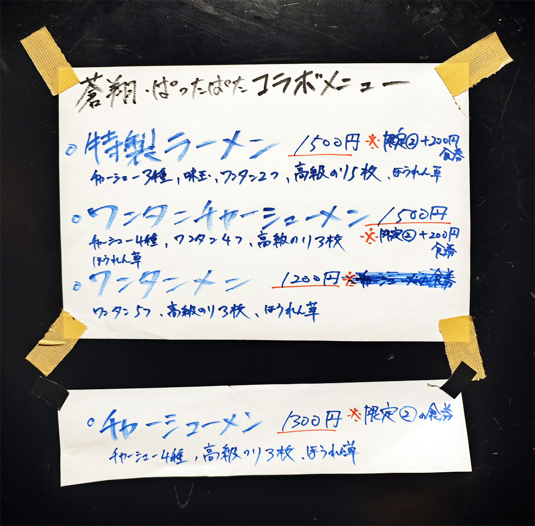 今回は、蒼翔・ぱったぱたコラボメニューの中から「ワンタンメン」を注文です。