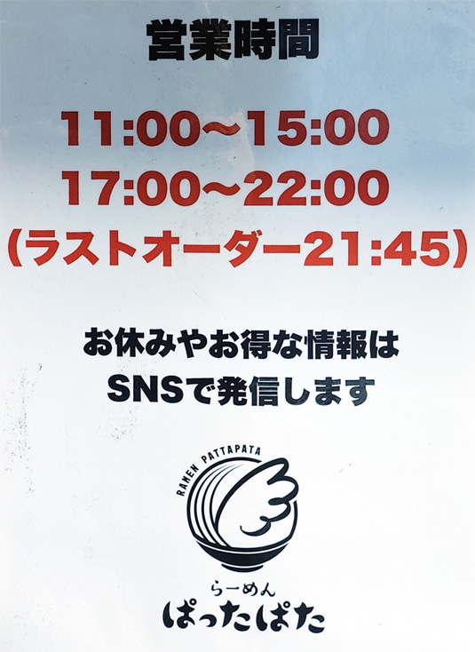 備考:元「立川つばさ家」店長の独立店。”羽衣町という町の名前とゼロからちょっとずつ羽ばたいて行きたい。"という思いから「ぱたぱた家」と命名。※※商標登録の関係で「らーめんぱったぱた」に途中で名前が変わります。