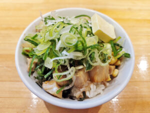 「コーンバターチャーシュー丼」は、サイコロ状のチャーシュー、コーン、ネギ、バターなど、ボリュームのあるトッピングが魅力です。