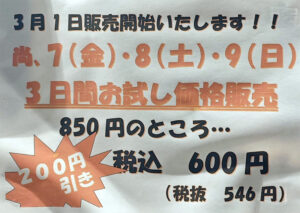 そしてなんと7日(金)、8日(土)、9日(日)は、3日間お試し価格販売として、通常価格850円のところ、200円引きの600円で提供されます!