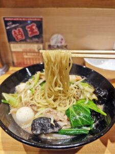スープが濃厚で、とろみもあるので、素直に太麺を合わせた方が良さそうですが、これはこれで悪くないです。
