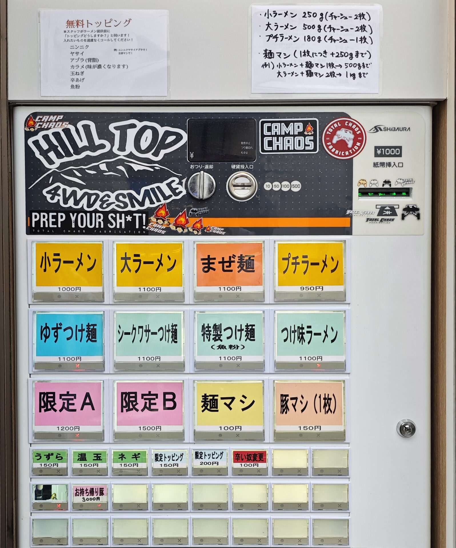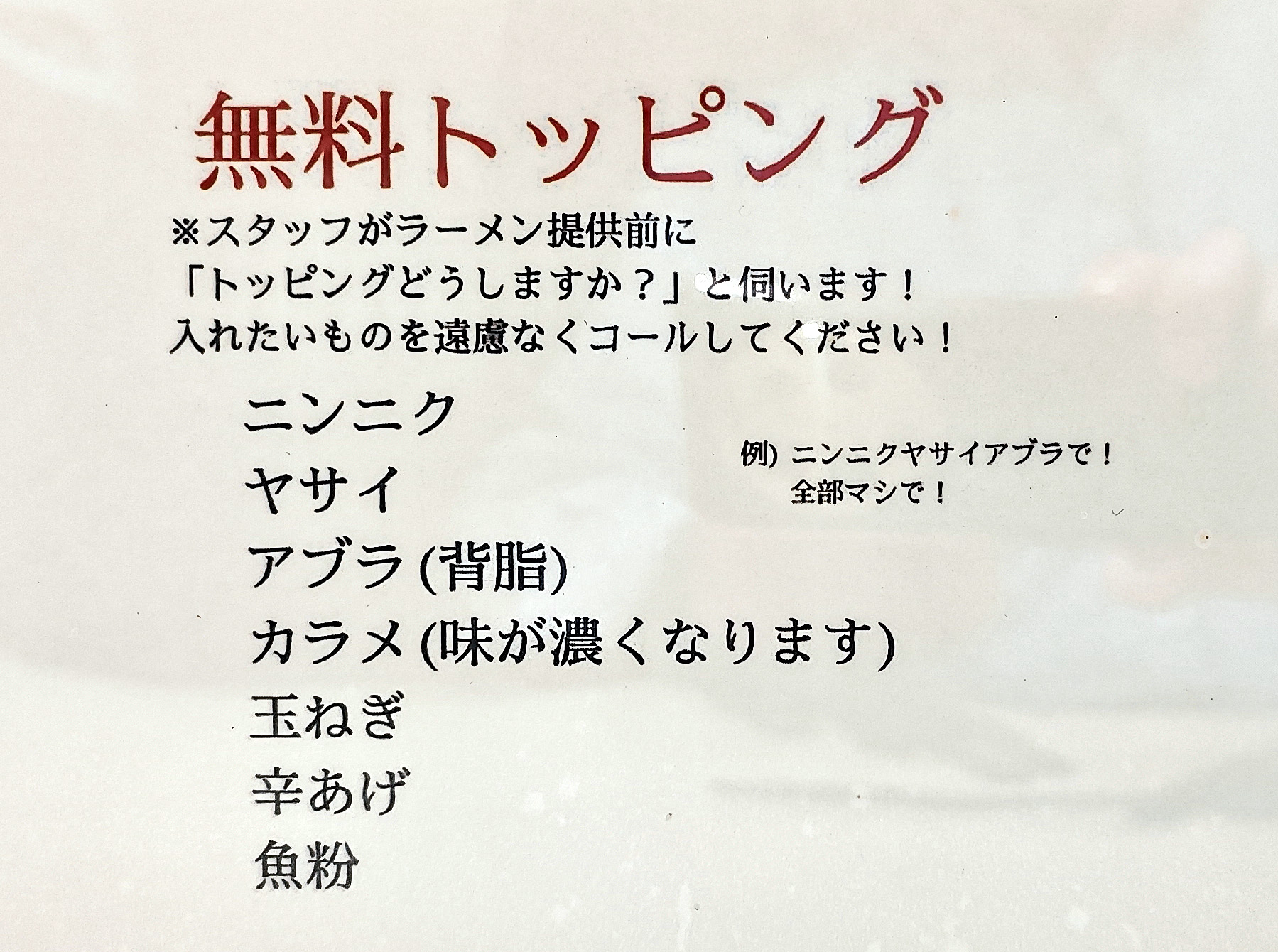 無料トッピングの種類⇒ニンニク、ヤサイ、アブラ(背脂)、カラメ(味が濃くなります)、玉ねぎ、辛あげ、魚粉。